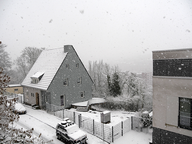 So ähnlich sieht es hier auch gerade aus. Hier ist ein richtiger Wintereinbruch aufmarschiert mir kräftigem Schneefall. Da die Böden recht warm sind, ergibt sich aber ein ziemlich fieser Schneematsch. Ich bin gerade von Mutti zurückgefahren und hatte doch etwas zu kämpfen. Direkt bei denen mit ich erst mal einfach geradeaus bis fast auf die Hauptstraße gerutscht. Danach ging es dann bei ruhiger Fahrweise. Besonders fies ist der leicht angetaute Schneematsch. Der war jetzt so rutschig. Naja, ich wollte ja unbedingt noch den einen Ordner fertig sortieren... Mal schauen, was sich morgen Früh für ein Szenario bietet. Es soll ja nachts deutlich abkühlen.