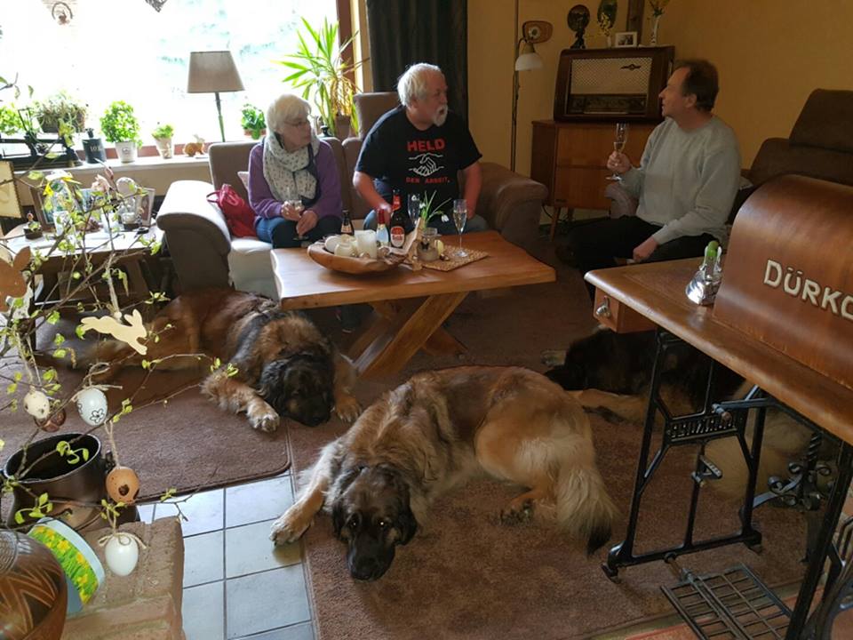 Links unterm Tisch: Rhonda, vorn in der Mitte: Rhondas Schwester Riga, rechts: Rüde Jascha.