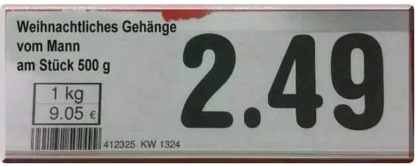 Das Beispiel gefällt mir auch mit am besten. Besonders treibt mich die Frage um, warum das pfundschwere Gehänge gegenüber dem doppelt so schweren Kilogramm-Gehänge nur etwa ein Viertel kostet (und nicht die Hälfte). Sollte das daran liegen, dass Gehänge im Kilogrammbereich so selten sind, dass hier ein Raritätenzuschlag erhoben wird? Oder braucht das schwerere Exemplar einfach nur deutlich mehr weihnachtlichen Schmuck?