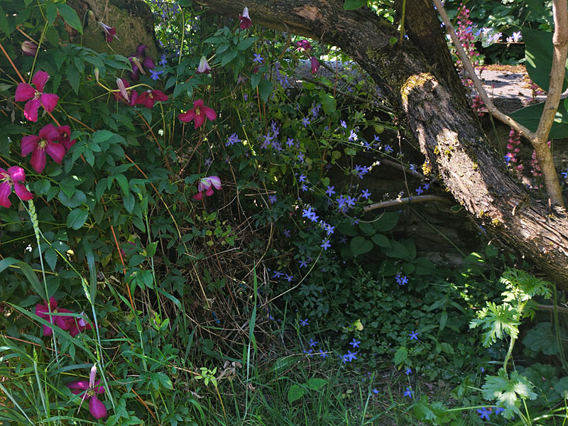 Die blauen Wucherglockenblumen haben ihre erste Blüte weitgehend hinter sich, nur im Schatten findet man noch welche.