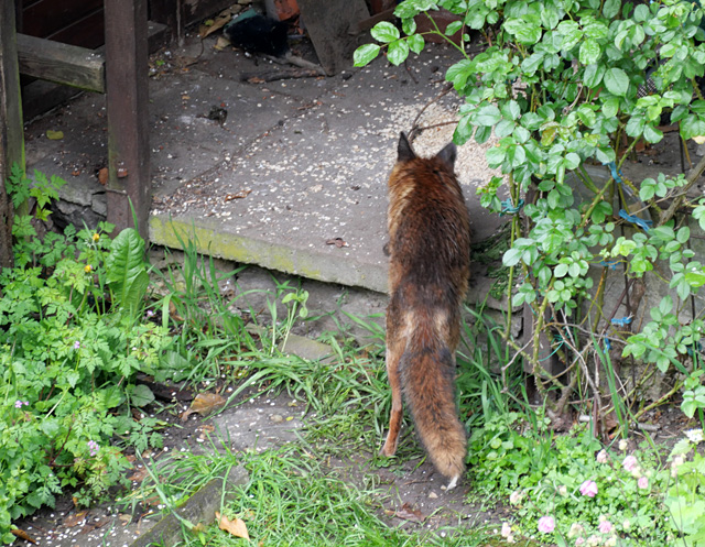 Den Fuchs habe ich aus einem Fenster im ersten Stock und aus einem Dachfenster geknipst, sonst wäre der längst weg gewesen.