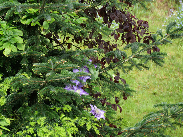 Vor ein paar Jahren hatten wir eine Waldrebe neben einen kleinen ausgesetzten Weihnachtsbaum gesetzt. Irgendwie hatte ich geglaubt, die Clematis sei uns abhandengekommen, bis der mir angetraute Ehemann vorletztes Jahr eine Blüte im mittlerweile ordentlich gewachsenen Tannenbaum entdeckte. So langsam werden es mehr Blüten. *freu*
