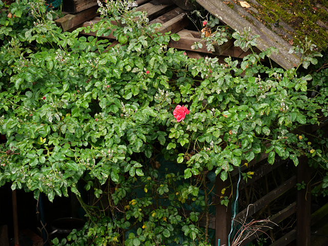 Nach Jahren des Vor-sich-hin-Dümpelns hat sich die vermeintlich blaue Rose "Rapsody in Blue", die aber eher bestenfalls lilafarbenen ist, doch noch dazu aufgerafft, zu einem halbwegs ordentlichen Strauch heranzuwachsen.