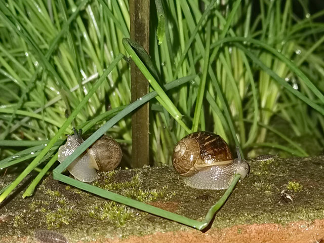 Manchmal finde ich es erstaunlich, welche Wege Schnecken gehen. Etwa wenn sie 3 Meter hoch miiten in der Sonne auf einer Hauswand oder dem Dach meines Unterstandes sitzen, wo sie gebraten werden und zudem auch keine Pflanzen sind.