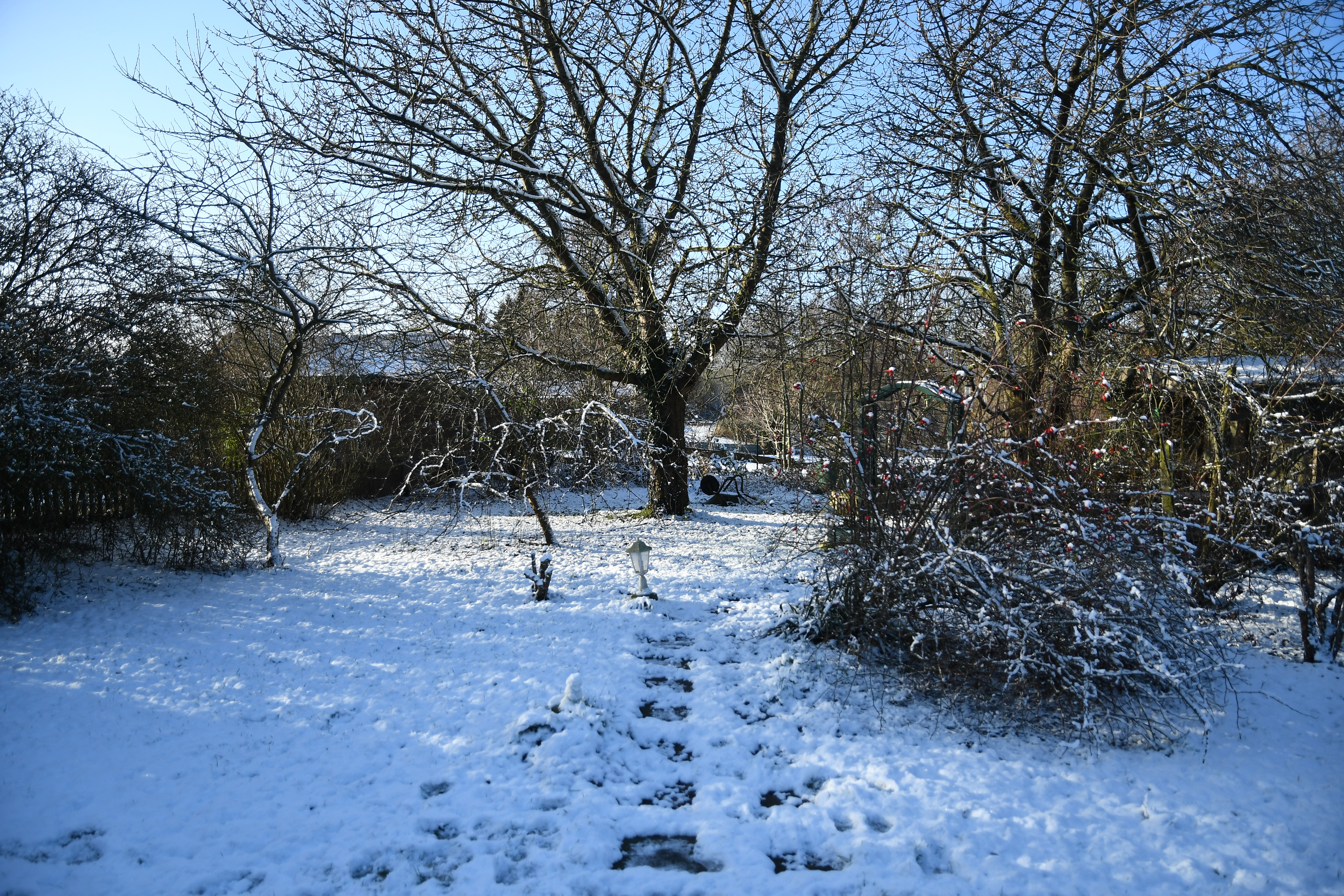 Wir haben hier eine leichte Schneedecke mit Hang zum in der Sonne tauen. Mit Sonne sieht das richtig nett aus. Ist nicht ganz so kalt wie in den letzten Tagen, reicht aber auch.