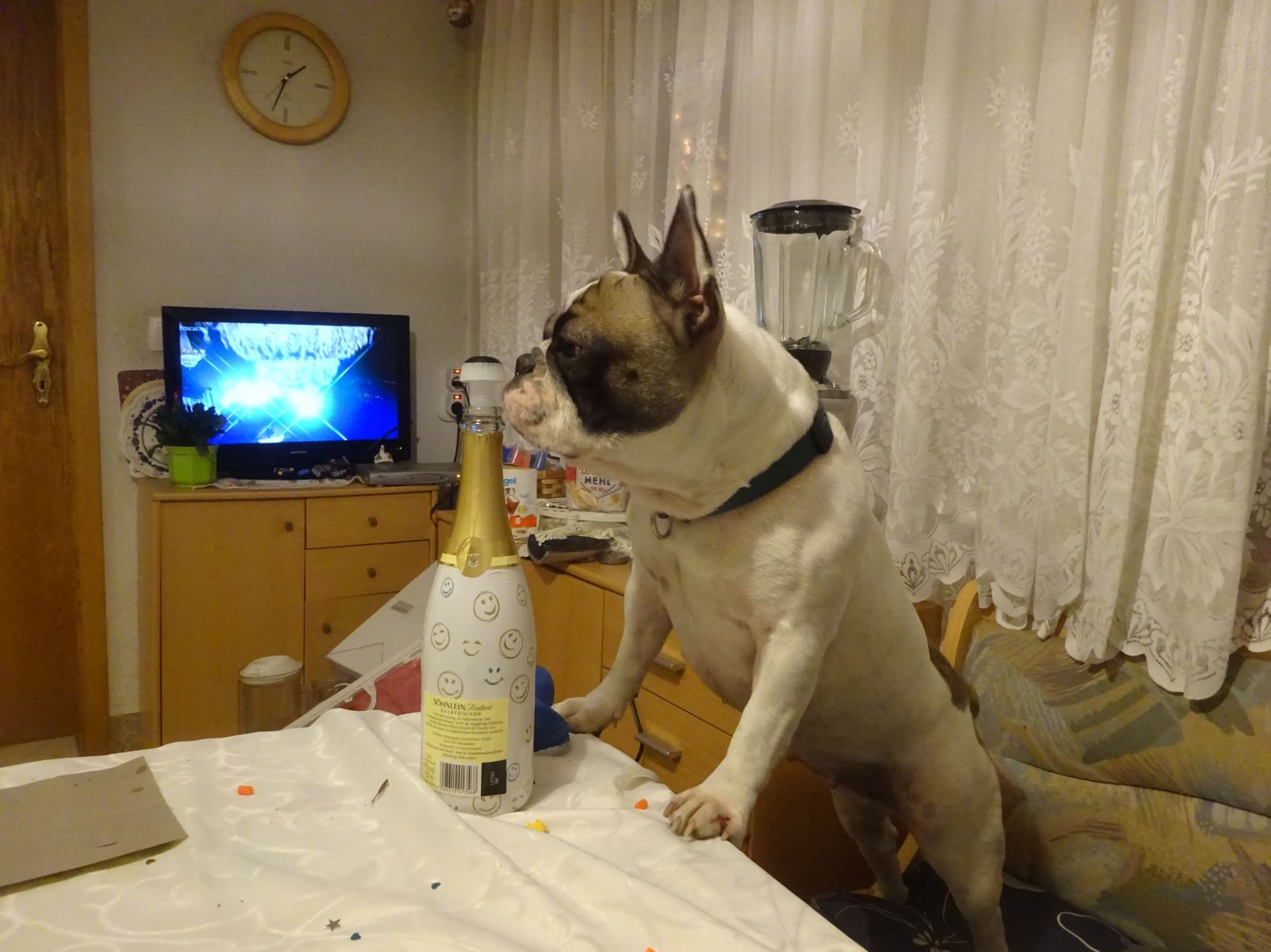 hier ein sylvester bild unserer haustyrannin. alkohol ist auch ein problem selbst leere flaschen. werd sie wohl mal einweisen lassen. :wink: